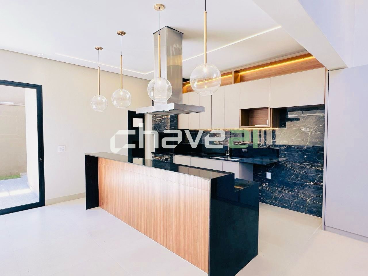 - Churrasqueira com coifa, ilha central, pia, armários planejados e cooktop de cinco bocas, tudo com iluminação em LED.