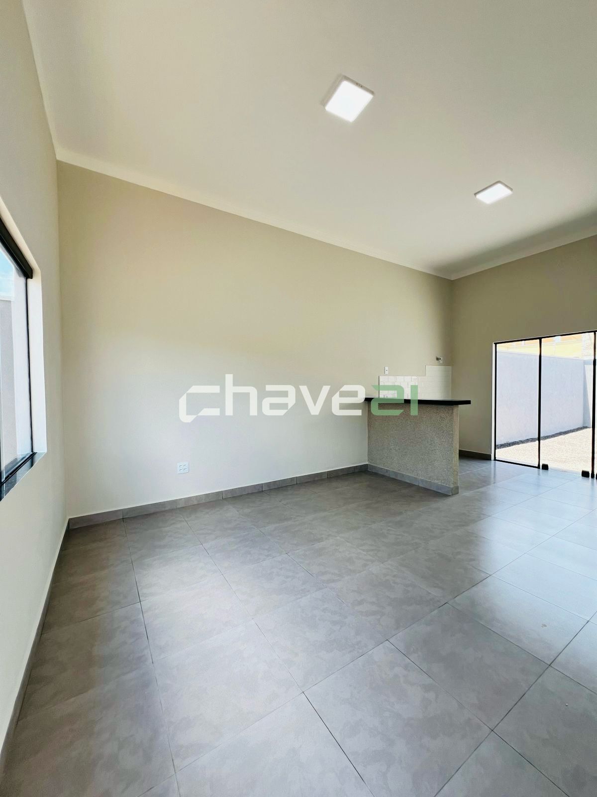 - Sala ampla integrada à cozinha, com pia e balcão