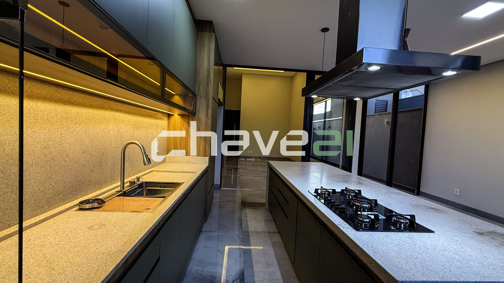 - Cozinha gourmet com ilha central, cooktop e coifa em inox